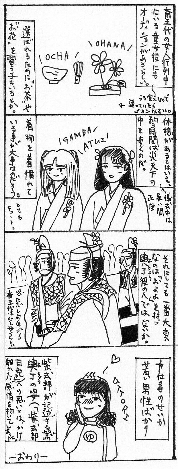 以上が、第一回「(勝手に)葵祭れぽ」でした。ちなみに『紫式部日記』が記す駕輿丁の姿はこちら。