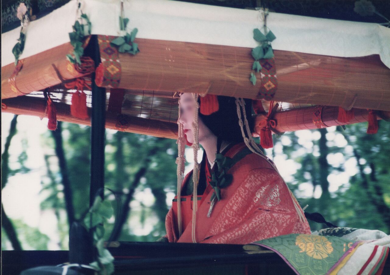 (現代では、御簾は巻き上げられています。車は「葵」の葉で飾られていて、斎王代も
