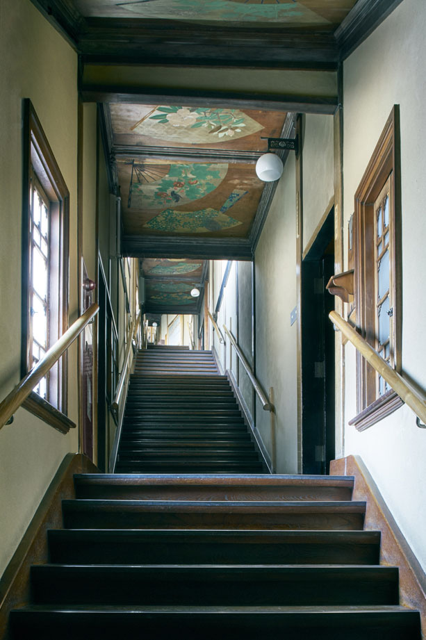 「百段階段」とは通称で、ホテル雅叙園東京の前身である目黒雅叙園3号館にあたり、1935(昭和10)年に建てられた当館で現存する唯一の木造建築です。食事を愉しみ、晴れやかな宴が行われた7部屋を、99段の長い階段廊下が繋いでいます。階段は厚さ約5cmのケヤキ板を使用。階段で結ばれた各部屋はそれぞれ趣向が異なり、各部屋の天井や欄間には、当時屈指の著名な画家達が創り上げた美の世界が描かれています。」