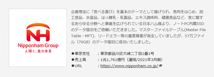 お客さまの声に、起動しなくなったノートPC内蔵SSDからのデータ復旧をご依頼いただきました日本ハム株式会社様のコメントを掲載しました。