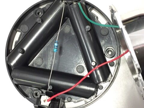 押しボタンスイッチに5.1Ωの電流制限抵抗が直接ハンダ付けされています。LEDの電流は、200mA前後の設計値ですね。