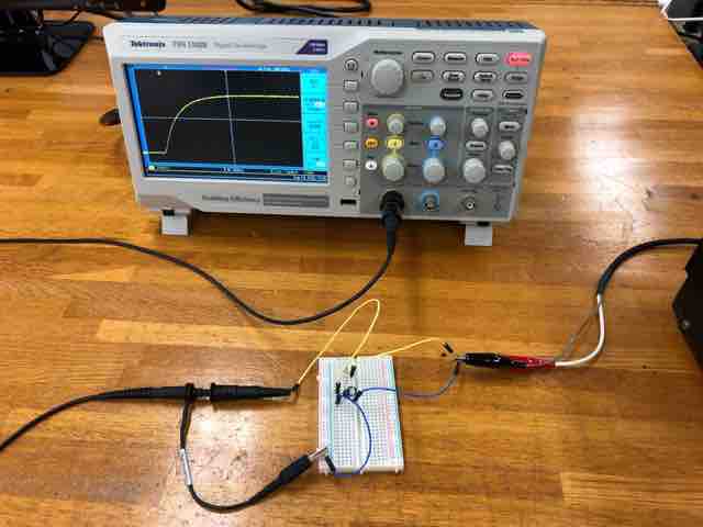 理論値からグラフを作成したら、オシロスコープで充放電の波形観測。