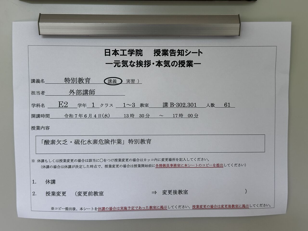 先日、電子・電気科の一年生たちが「酸素欠乏・硫化水素危険作業特別教育」を受講しました。