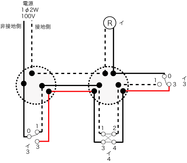 この問題は3路スイッチと4路スイッチの問題です。同じような問題が昨年度No.9として出題されています。3箇所でランプをつけたり、消したりすることが出来る回路です。