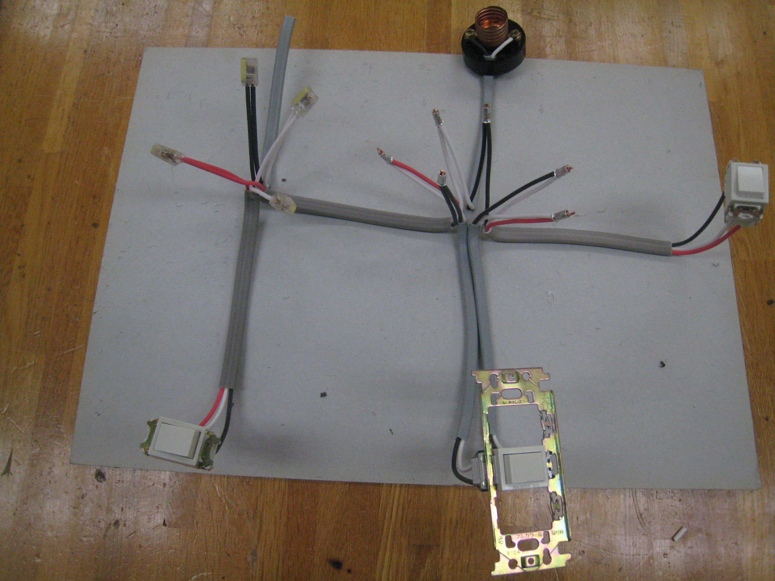 3路スイッチの場合は1と1、3と3を接続しますね、4路スイッチはその間に接続してください。この問題の場合には2つの3路スイッチの1と3に接続されたVVFケーブル2本を4路スイッチに接続してください。3路スイッチが理解できていれば、それほど難しくはないですよ。