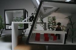 今日、紹介するのは山中君の作品で「CUBE CAFE」。カフェのデザインですが、「重ねる」というテーマから積み木を連想し、それを複雑に重ねたり、はめ込んでみたりするなど試行錯誤してデザインしました。その結果外からは勿論、内部からもCUBEが重なっているのが判る楽しい空間になりました。こんなカフェでコーヒーを飲んでみたいと思いませんか? (担当:井口)