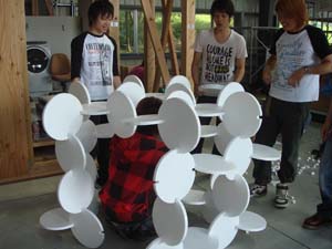 建築設計科1年生の設計製図の課題で取組んでいる「初めての建築」。9月初旬に個々に設計した作品の発表をして、各クラスから選ばれた計8作品の実物大スケールでの制作がスタートしました。それぞれの作品は10名前後のグループでの作業となり、チームワークで順調に制作が進むグループや、そうでないグループ・・・様々です。写真のグループは順調にスタートして、今日は設計通りに部材の加工や接合がうまくできるかどうか、実際よりも少し小さいスケールでスタディしています。10月11(日)、12日(祝)の「紅華祭」での展示に向けて、頑張って制作していきますので、みなさん、ぜひ「初めての建築展」(ものづくり工房)を見に来て下さい!!(担当:中條)