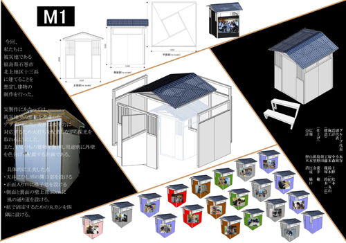 私たちは被災地である福島県石巻市北上地区十三浜に建てることを想定し建物の制作を行なった。実製作にあたっては、被災地での建築を考慮したデザインとした。天井は水平力に対応するため火打ちを配置しながら採光を取れるようにした。また、いくつもの建物を製作し用途別に外壁を色分けして配置する計画である。