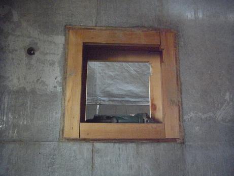 3開口部型枠 壁には窓が付き物ですよね。窓が取り付く部分にはコンクリートが固まってもらいたくないので、そこだけせき止める必要があります。加工しやすい木材を用いて取り付けるサッシの外回りより5cmほど大きめに止め枠をしている状態になります。この後、木材部分を全て取り除きますが、分解しやすいようにパーツが分かれていることが、写真から分かりますか?(担当:赤石)