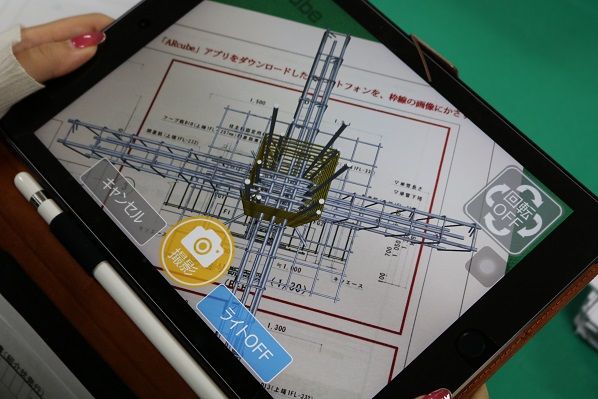 写真は、紙の図面にiPadをかざすと3次元モデルとして配筋が立体的に見える様子です。最新技術に触れることができ、これからBIMを学ぶ学生にとって、なぜこれからの時代にBIMが必要なのかを考えるきっかけとなたのではないでしょうか。(担当:小林)