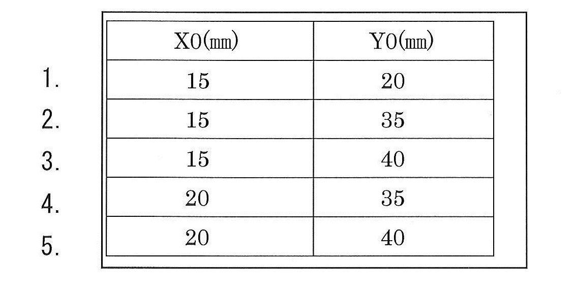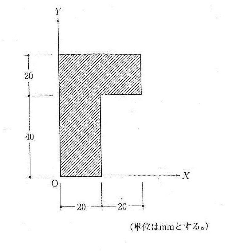 図のような断面において、図心の座標(x0、y0)の値として、正しいものは、次のうちどれか。ただし、x0=、y0=であり、Sx、SyはそれぞれX軸、Y軸まわりの断面一次モーメント、Aは全断面積を示すものとする。