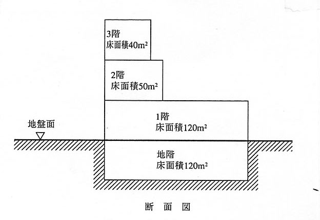 地階を有する住宅であり、断面の形状から法第52条第3項を適用できる。建築物の延べ面積は、