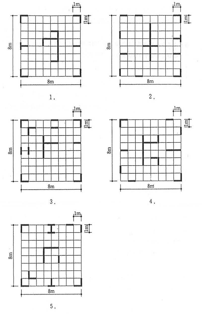 在来軸組工法による木造平家建の建築物(屋根は日本瓦葺とする。)において、図に示す平面の耐力壁(図中の太線)の配置として、最も不適当なものは、次のうちどれか。ただし、すべての耐力壁の壁倍率は1とする。