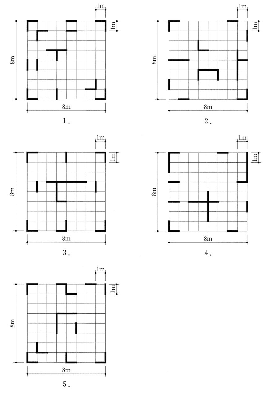 木造軸組工法による平家建の建築物(屋根は日本瓦葺:地震力に対する必要壁率は15cm/m2である。)において、図に示す平面の耐力壁(図中の太線)の配置として、最も不適当なものは、次のうちどれか。ただし、全ての耐力壁の倍率は1とする。