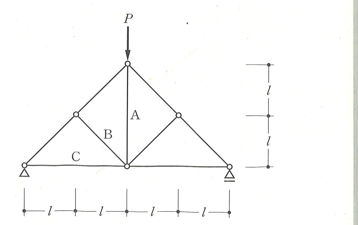 図のような荷重Pを受ける静定トラスにおいて、部材A、B、Cに生じる軸方向の組合せとして、正しいものは、次のうちどれか。