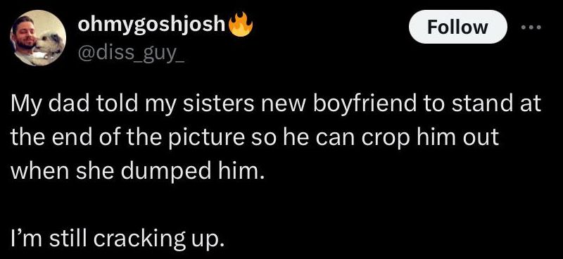 「うちの父親は妹の新しい彼氏に、妹が彼を振ったときに彼だけ切り取れるように、写真の端に立つように言った。私はまだ笑いが止まらない」