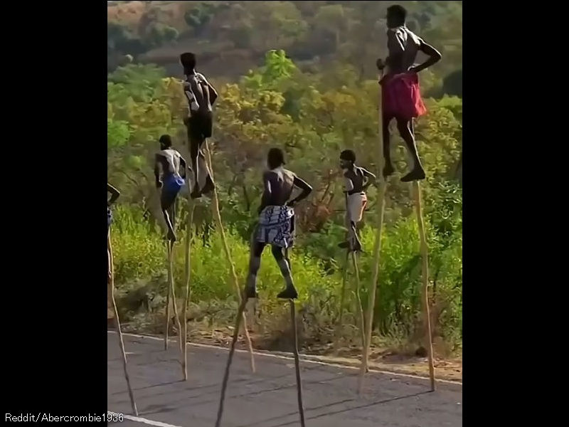 ↑ヘビだけではないよ......竹馬はもともと、牛を放牧中に様々な野生動物に襲われないよう、それらから身を守るために考案された。現在では文化的見世物としても機能し、若者たちの成人儀式として、また結婚式や祭りなどの儀式におけるパフォーマンスとしても用いられている。竹馬歩きは彼らの文化において重要な位置を占めており、もっと詳しく読んでみることをお勧めするよ。