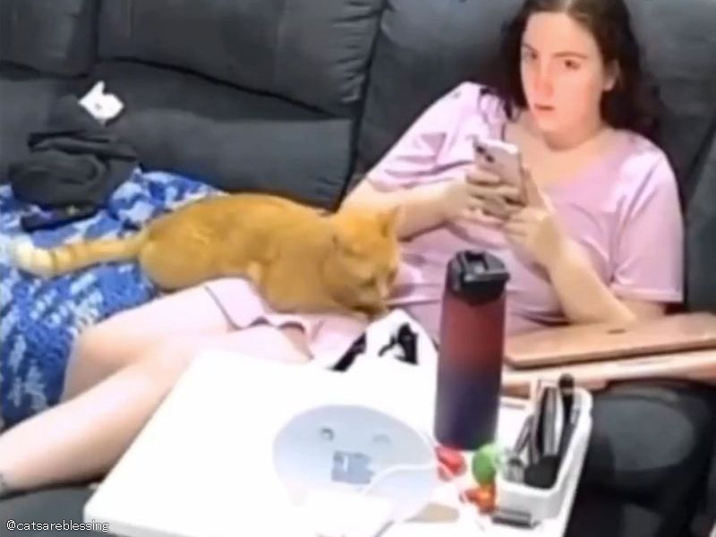 続きを読む ]]>猫が初めてヒザの上に乗ってきて、ドキッとする飼い主女性をご覧ください。