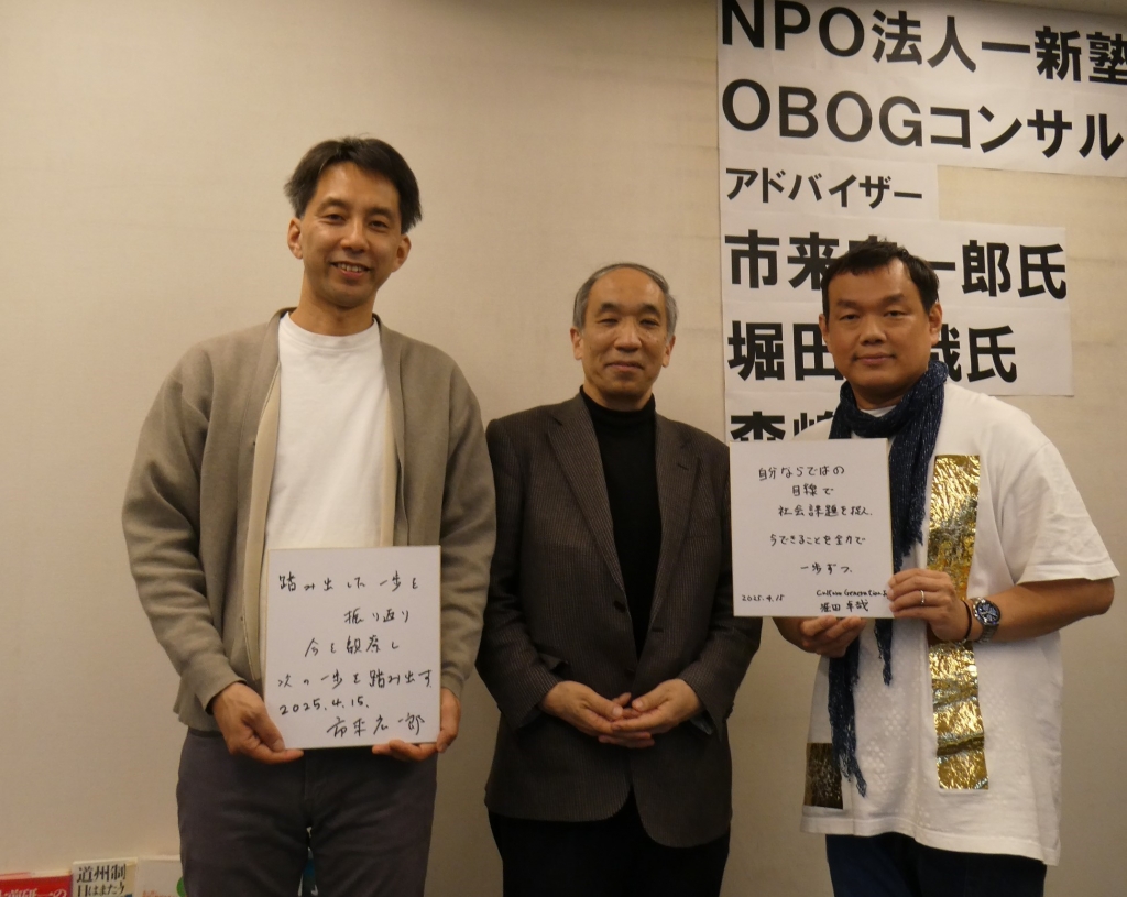 今週は、一新塾卒塾生プロジェクトを後押しする「OBOGコンサルティングコース講座」。アドバイザーとしてお越しいただいたのは、一新塾OBの市来広一郎さんと堀田卓哉さんです。前半はお二人から10分ずつプレゼンテーション。お二人には、それぞれ、志を羅針盤に、大きなビジョンを描き、スモールステップで行動を積み上げ続け、道なき道を切り拓く歩みを語っていただきました。