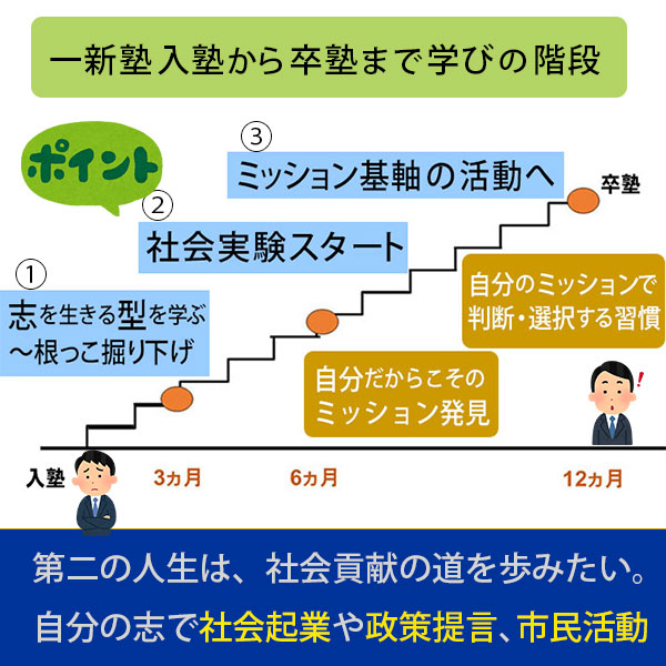 NPO法人 一新塾は、自分だからこその志で社会貢献の道を探す場です。