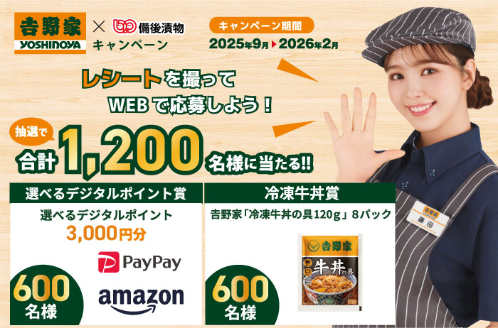 対象商品いずれか一つをお買い上げのレシートでWEBからご応募いただくと、抽選で1,200名様に吉野家「冷凍牛丼の具120g」や選べるデジタルポイントをプレゼントいたします。