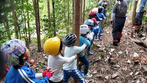 各班(3班で実施、1+2班、3+4班、5+6班)、リーダーの指導の下、受け口・追い口を苦労しながら切って、けん引ロープを伐倒木に結び付けて、折り返し滑車を人に結び付けて、生徒がロープを引っ張って倒す工程を体感した。3+4班では、生徒の1人が折り返し滑車に立候補。しかし、生徒の引っ張る力は大きくて、固定されているべき折り返し滑車の生徒が、伐倒木に近づいて行く光景も見られ、各班で笑いが起こっていて和気あいあい進められていた。