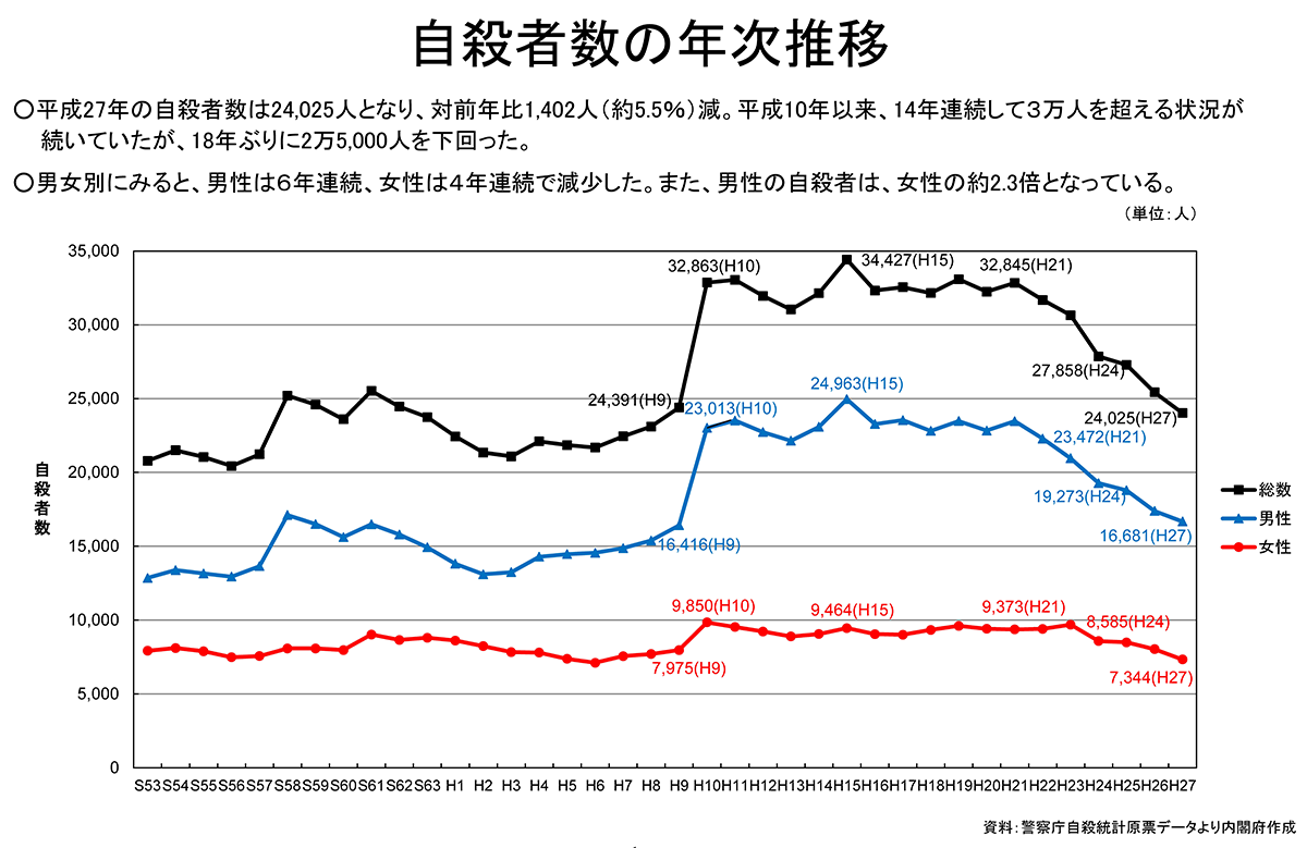 年間自殺者数は2009年から7年連続で減少し、2016年には2万1897人と22年ぶりに2万2千人を下回りました。