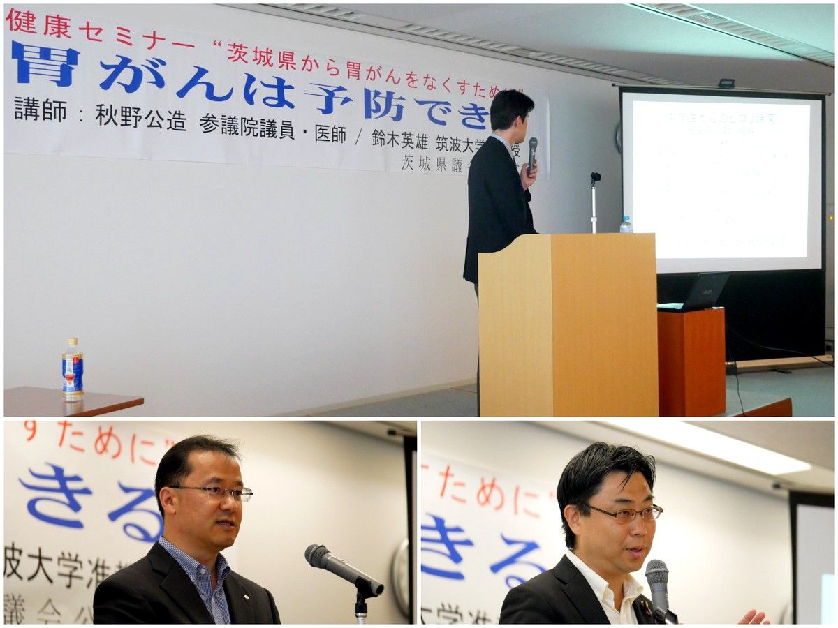 茨城県議会公明党(井手義弘幹事長)は16日、水戸市内で健康セミナーを開催した。同セミナーでは、筑波大学の鈴木英雄准教授、公明党の秋野公造参院議員(医学博士)が講師を務め、胃がんを予防するための対策などが紹介された。
