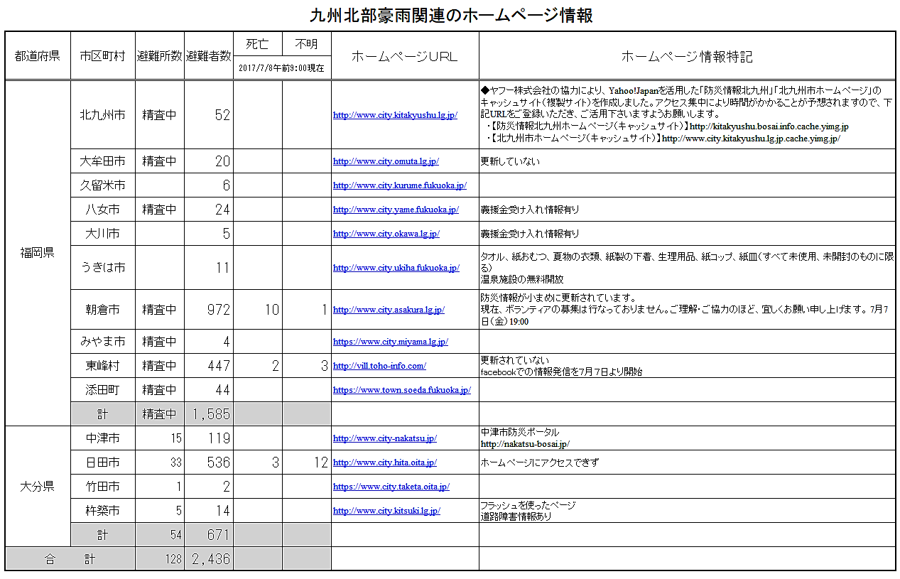 なお、一番被害が大きい、東峰村(facebookで情報発信)、日田市のホームページにはアクセスできません。