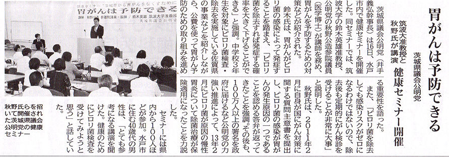 7月27日付け公明新聞7面に、井手よしひろ県議ら茨城県議会公明党が、7月16日に開催した「健康セミナー・胃がんは予防できる」の模様が掲載されましたので、ご紹介します。