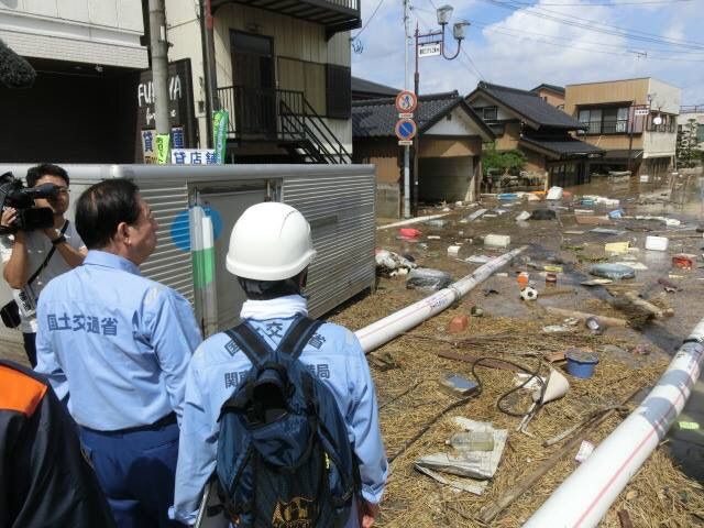 9日、石井啓一国交大臣(公明党茨城県本部顧問)が、豪雨被害の最も大きい福岡県朝倉市、東峰村、そして大分県日田市の被災地に入りました。