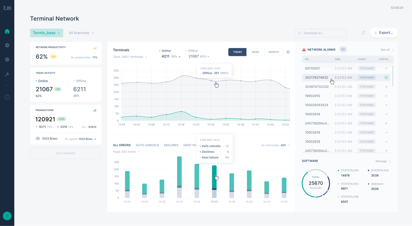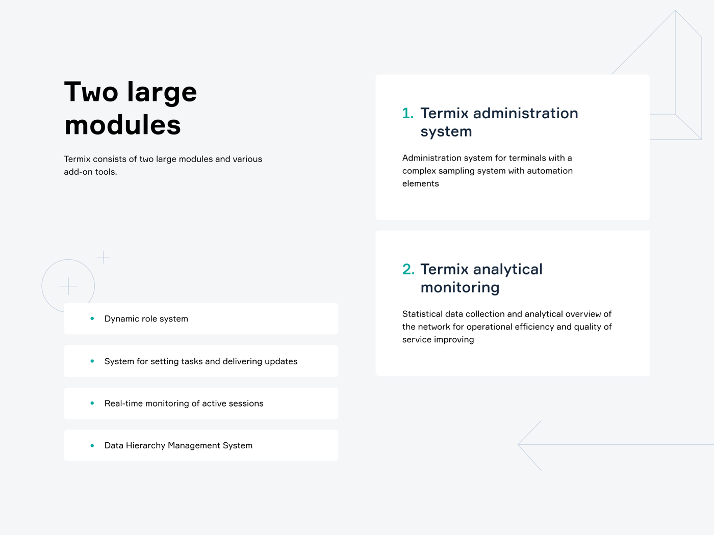 Termix is a remote management, monitoring, and control system of POS terminals in the bank's acquiring network. Developed through our SaaS software development services , the system improves the efficiency of the terminal network, reduces maintenance costs, and increases its income and the speed of technical support response.