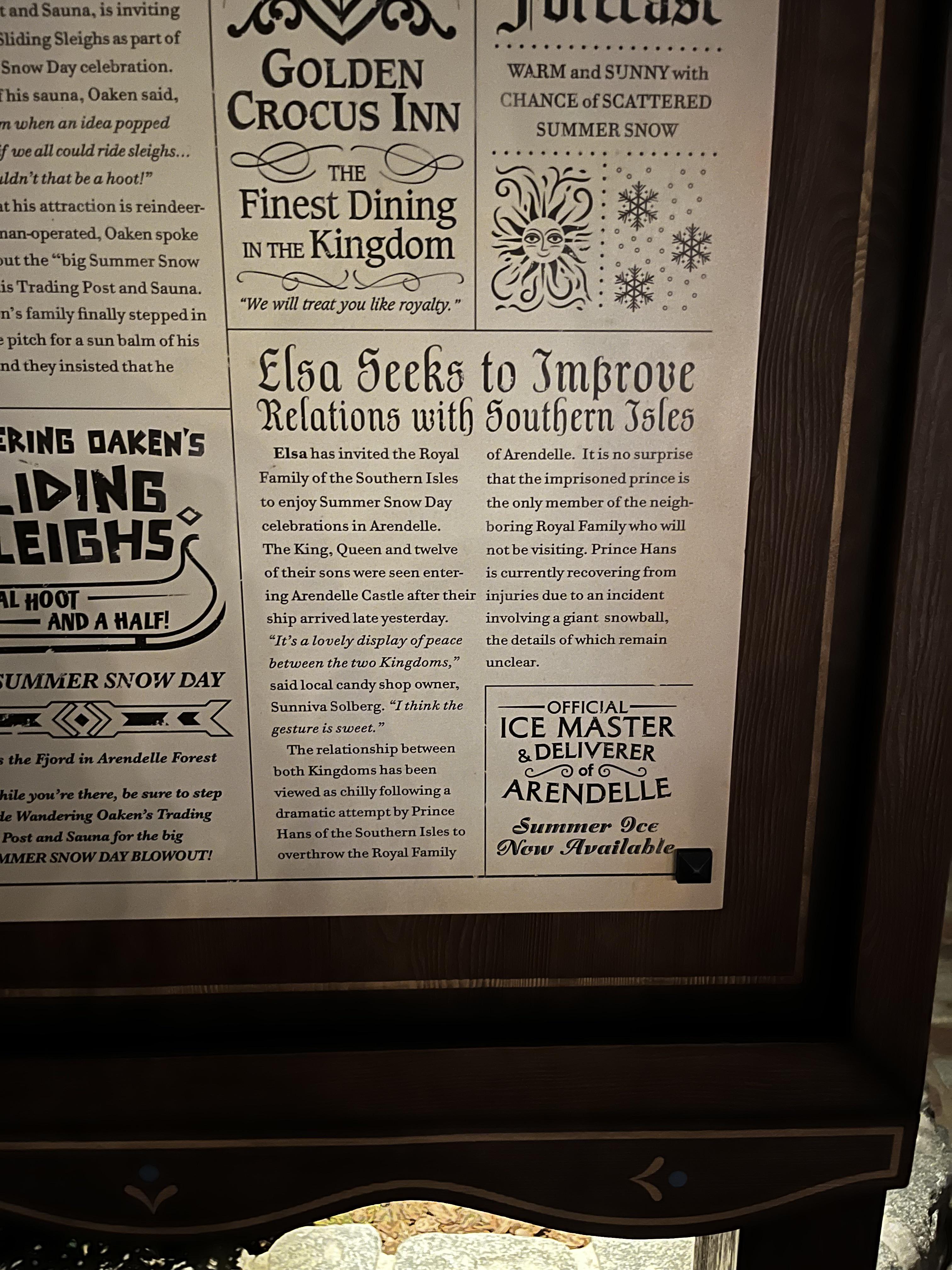 While not appearing in the attraction itself, a news page featured in the queue of Frozen Ever After references Hans and refers to him to as the "disgraced" son of the King of the Southern Isles.[2]