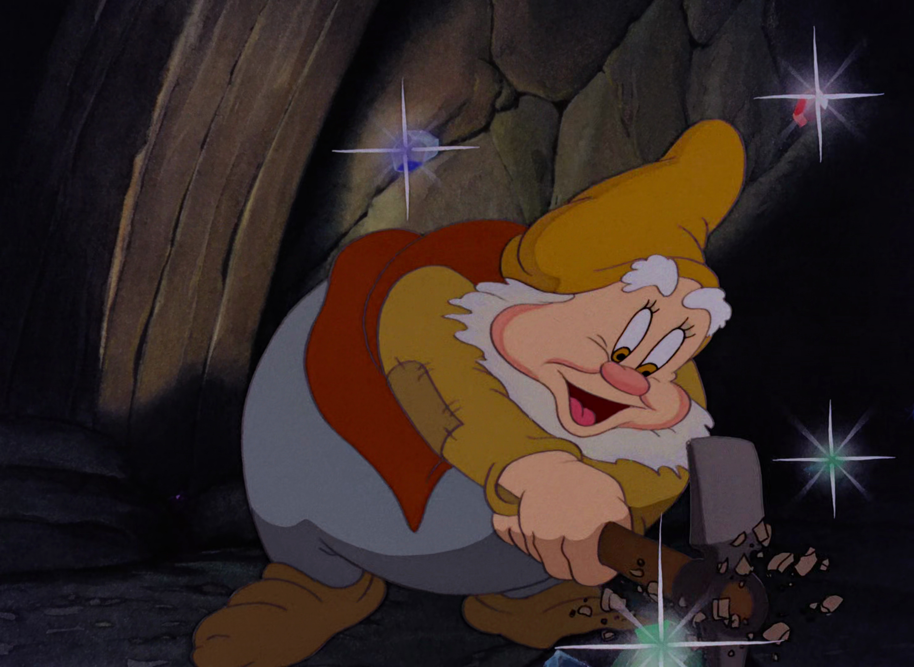 Happy is first introduced, with his seven companions, at the Dwarfs' Mine. He, Bashful, Sneezy, and Grumpy dig to unearth diamonds from the tunnels. The diamonds are taken by Sleepy to Doc, who puts the valuable diamonds in bags to keep and discards the worthless diamonds for Dopey to sweep away. Doc is the first to hear the alarm and alerts the other dwarfs that it is time for them to go home. Happy walks behind Grumpy as the dwarfs sing "Heigh-Ho".