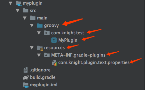 MyPlugin.groovy不是.java文件,这里也直接创建java文件,然后修改后缀名,groovy是支持Java语言的(所以说Groovy的学习成本不是很大,感兴趣可以在网上搜索一下)resources目录下的META-INF.gradle-plugins的顺序不能错。com.knight.plugin.test(ps:图片中的字母写错了,项目中已改)就是你的plugin名称