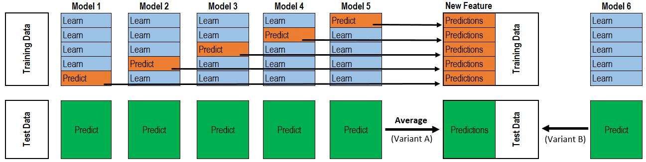 主要思路是:根据最佳单模型的xgb特征评分排名将特征集分量两个子集(1、3、5....和2、4、6...)作为基模型的训练集。基模型包括ET、RF、Xgboost,3个基模型分别训练这2个特征子集,保证相同的cv和seed。这样训练完成得到验证集的预测值拼接成新的训练集,一共可以得到6个新特征(2组特征子集,3个模型),最后第二层基于这些新特征训练ET模型,这里可以加上一部分你的原始特征,也可以组合新的特征,这些都值得尝试。Stacking的过程是非常耗时的,因为需要跑多个模型以及多次cv,我16G内存,i7 cpu跑一次完整的需要七八个小时。至于Stacking带来的提升,本次比赛并没有带来火箭, stacking的思路可以参考下面这张图,如果难以理解建议多查资料或者直接请教别人,然后看代码实现,我一开始也是觉得懂了,但是用起来发现细节还是不清楚。 相关博文: