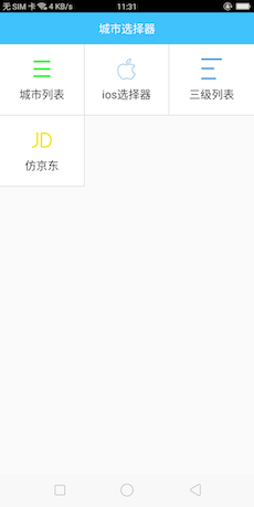 - 支持仿iOS滚轮实现、仿京东样式、一级城市列表、三级城市列表