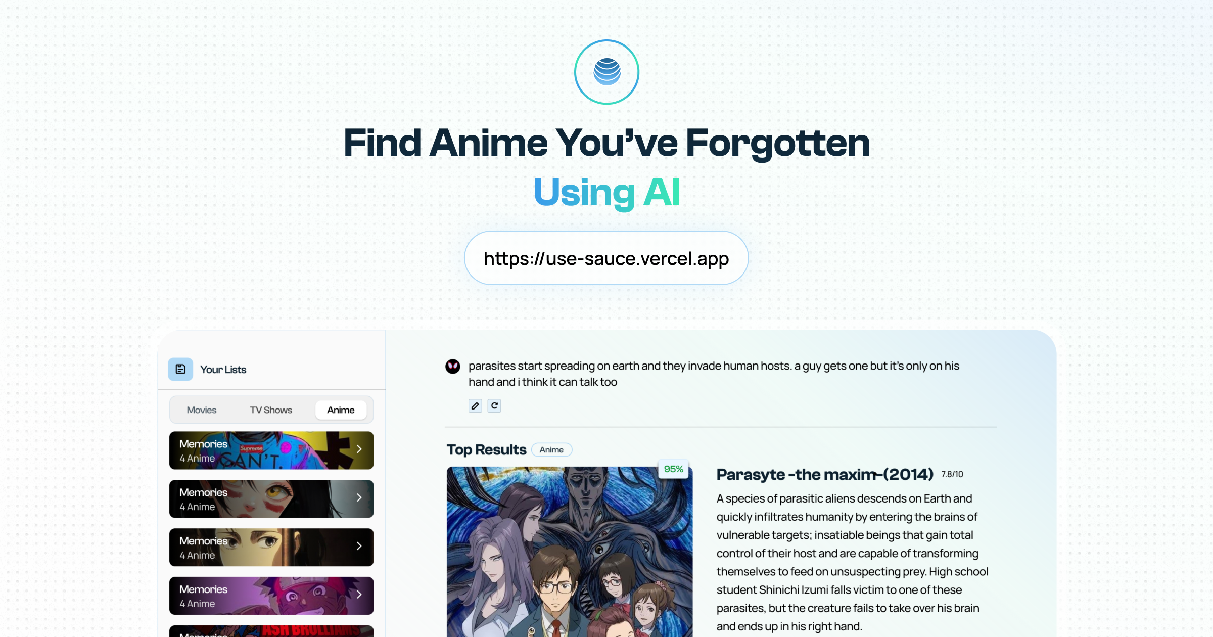 Sauce is a powerful web application designed to help you rediscover Anime, TV shows, and Movies you've forgotten. Just provide any description or fragmentary details you remember – it doesn’t have to be perfect. Sauce uses AI to match your description with the right title, bringing those lost memories back to life. Whether it's a scene, a character, or a vague plotline, Sauce will help you find what you're looking for with ease.