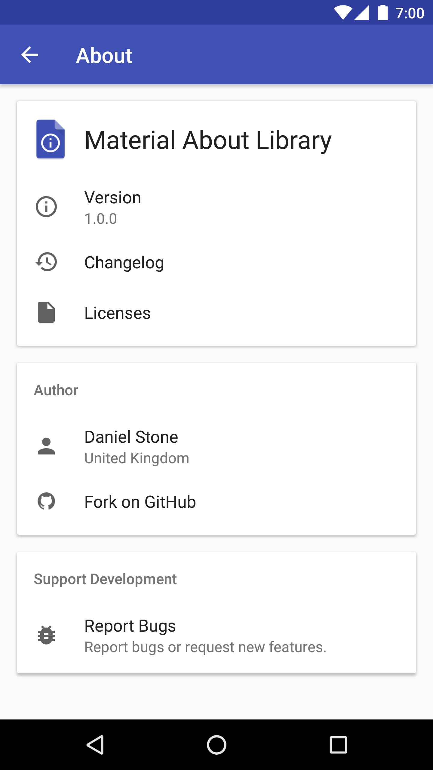 MaterialAboutActionItem: Standard item with text, icon and optional subtext.MaterialAboutTitleItem: Larger item with large icon (eg app icon) and larger text.