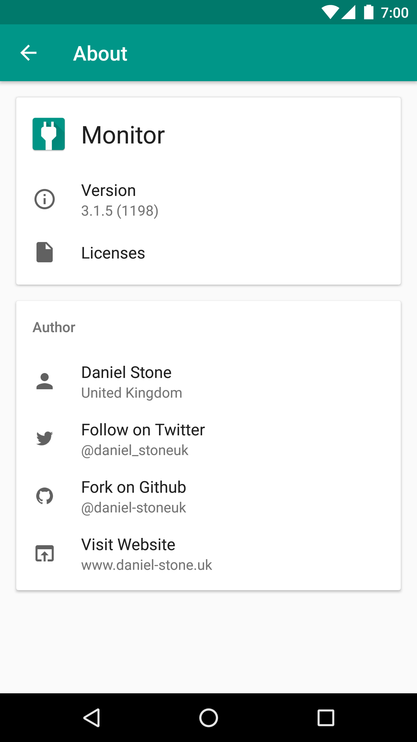 | Demo App | Example | |:-:|:-:|:-:|:-:| | Demo App | Monitor | | ExampleMaterialAboutActivity.java | Monitor |