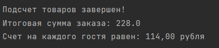 System.out.println("Счет на каждого гостя равен: " + result + " рублей");
