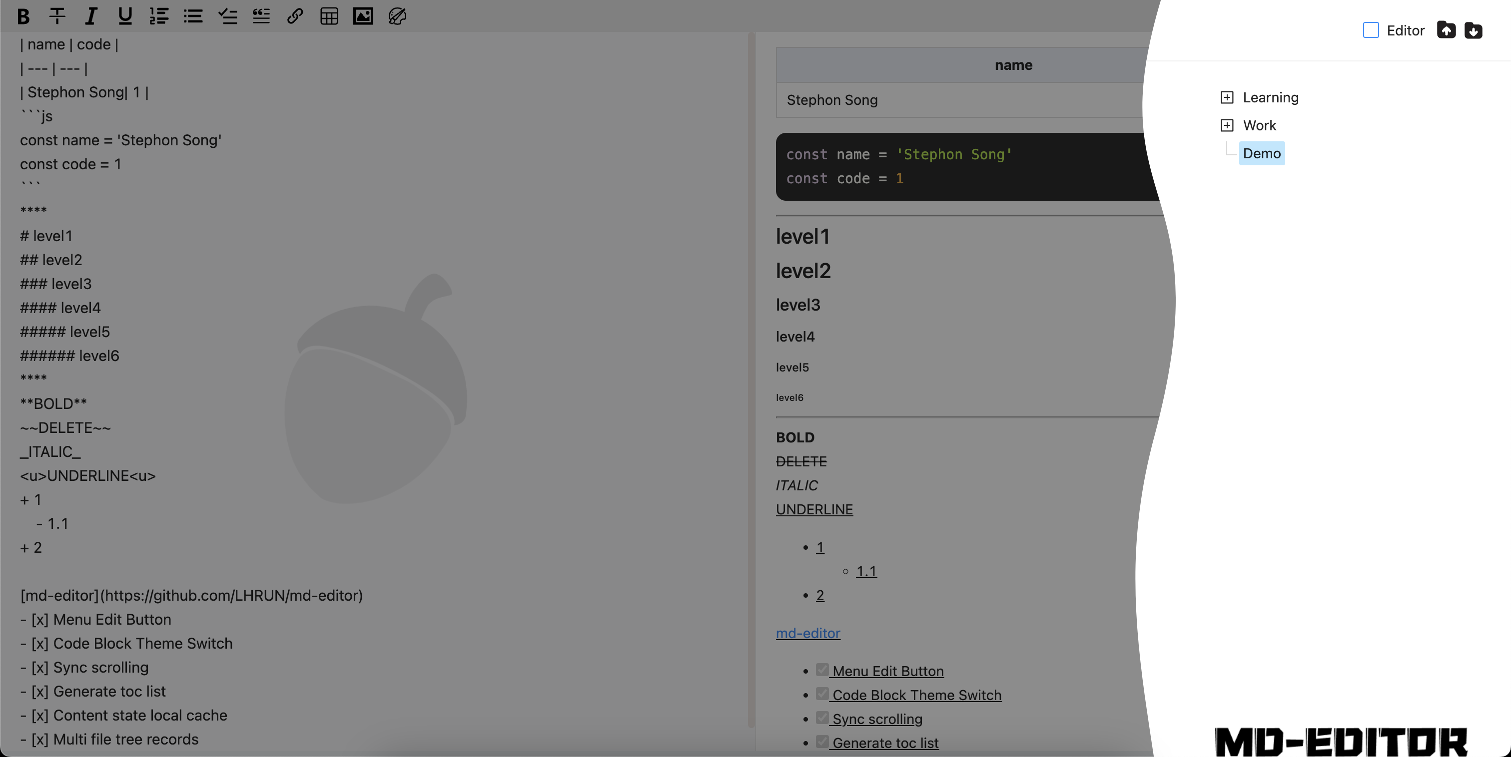 ├─components │ ├─icons │ ├─multiFile // Multi file drawer │ └─toolbar // Top Menu │ ├─context │ ├─file // multi file provider │ └─index // app provider │ ├─hooks │ └─event.ts // event hook │ ├─views │ └─editor // editor page │ └─utils ├─constants ├─common ├─editor // editor utils ├─md // markdown-it instance ├─scroll // sync scroll ├─storage // local cache ├─multiFile └─toc