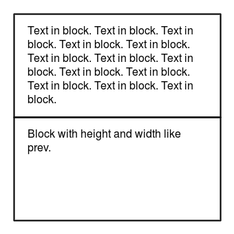 // ..... $idg->beginBlock(); $idg->text('Text in block.') ->setMargin(10, 20, 20, 20); $idg->endBlock(); $idg->beginBlock()->setStaticHeight(function(\Idg\Elements\Element $element) { return $element->getPrevSibling()->getHeight(); }); $idg->text('Block with height like prev.') ->setMargin(10, 20, 20, 20); $idg->endBlock(); // .....