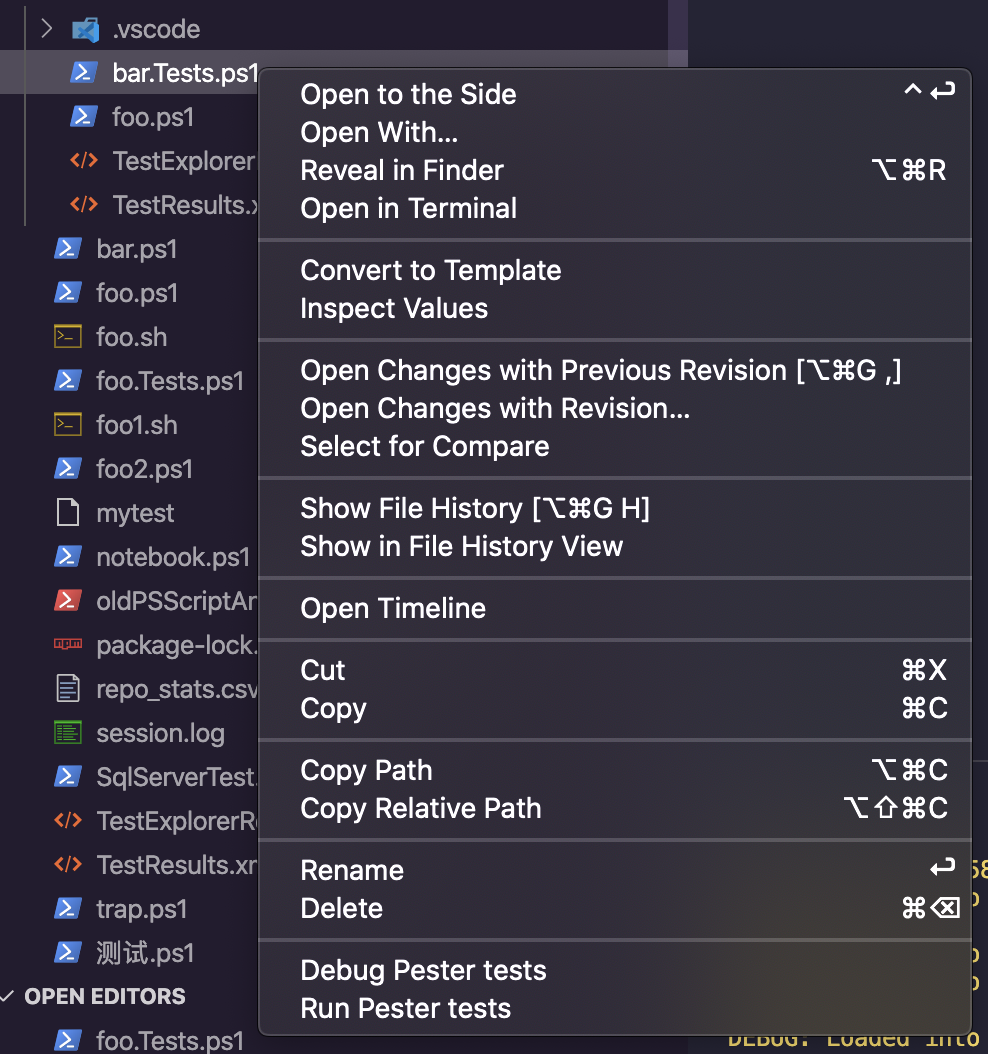 section, that controls the what shows in the context menu when you right click on file in the explorer pane (to see what I've talking about, right click on a foo.Tests.ps1