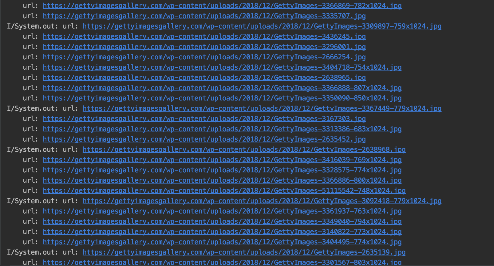 val con = Jsoup.connect("https://gettyimagesgallery.com/collection/sasha/").timeout(10000) Log.d("parse Url", "connection setup and parsing start") val elements = con.get().select("div.item-wrapper img.jq-lazy") if (!elements.isEmpty()) { for (e in elements) { val url: String = e.attr("data-src") //DiskLruCache key 형식 제한 때문에 잘라야함 println("url: "+url) val key = url.split("-")[2].replace("[^0-9]".toRegex(), "") UrlData.keyList.add(key) UrlData.urlList.add(url) } Log.d("parse Url", "parsing done") } else{ //데이터 못받아올 경우 Log.d("parse Url", "data load fail") (mContext as MainActivity).showNetworkDialog() }