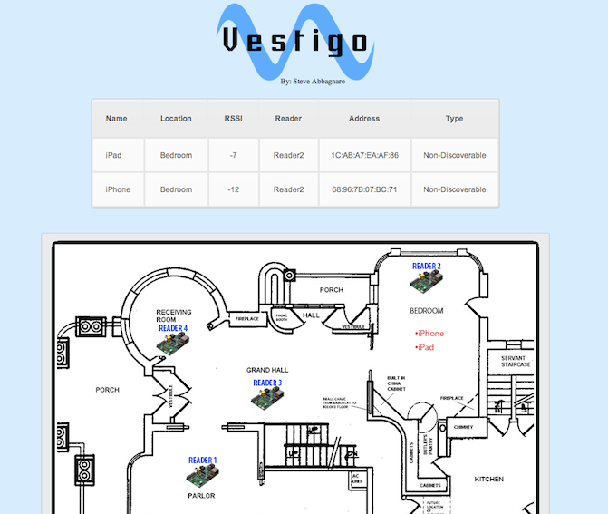 Vestigo is a proof of concept and educational project I took on to learn about, develop and show the ability and practicality of using the Bluetooth standard as a means to track asset locations in real-time.