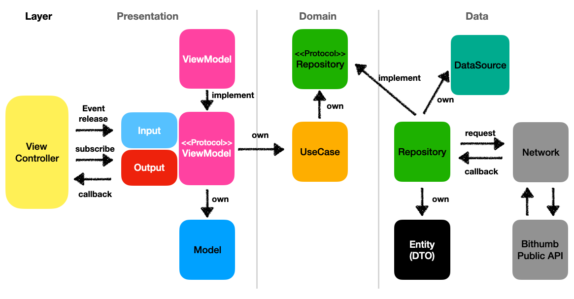 - MVVM을 도입하여 뷰컨트롤러와 뷰는 화면을 그리는 역할에만 집중하고, 데이터 관리, 비지니스 로직은 뷰모델에서 진행하여 역할을 명확히 하였습니다.