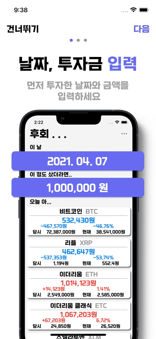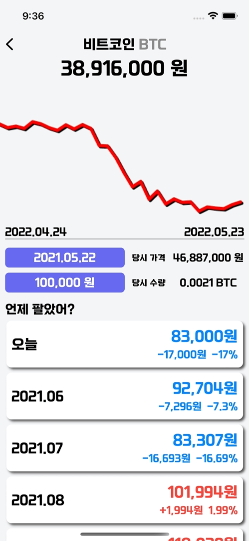 - 투자 날짜, 투자금을 Input으로 받은 후 ViewModel에서 가격 비교 및 손익 계산한 후 뷰에 반영하였습니다.