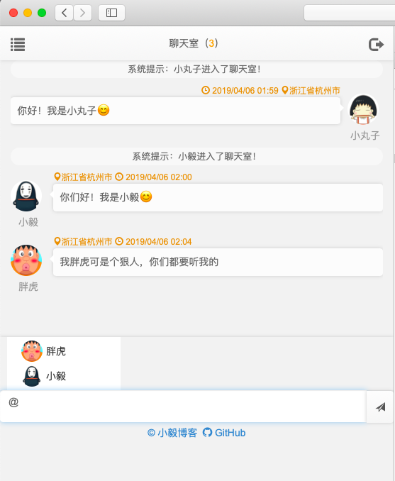 点击右侧按钮退出聊天室,系统广播离线消息,在线用户列表和在线人数自动更新