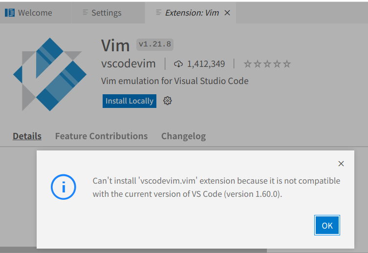 - Report an error "Can't install 'vscodevim.vim' extension because it is not compatible with the current version of VS Code (version 1.60.0)."